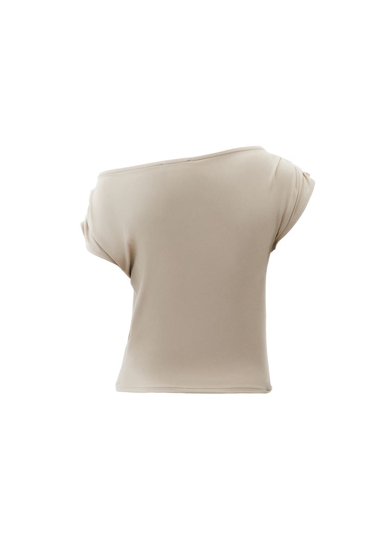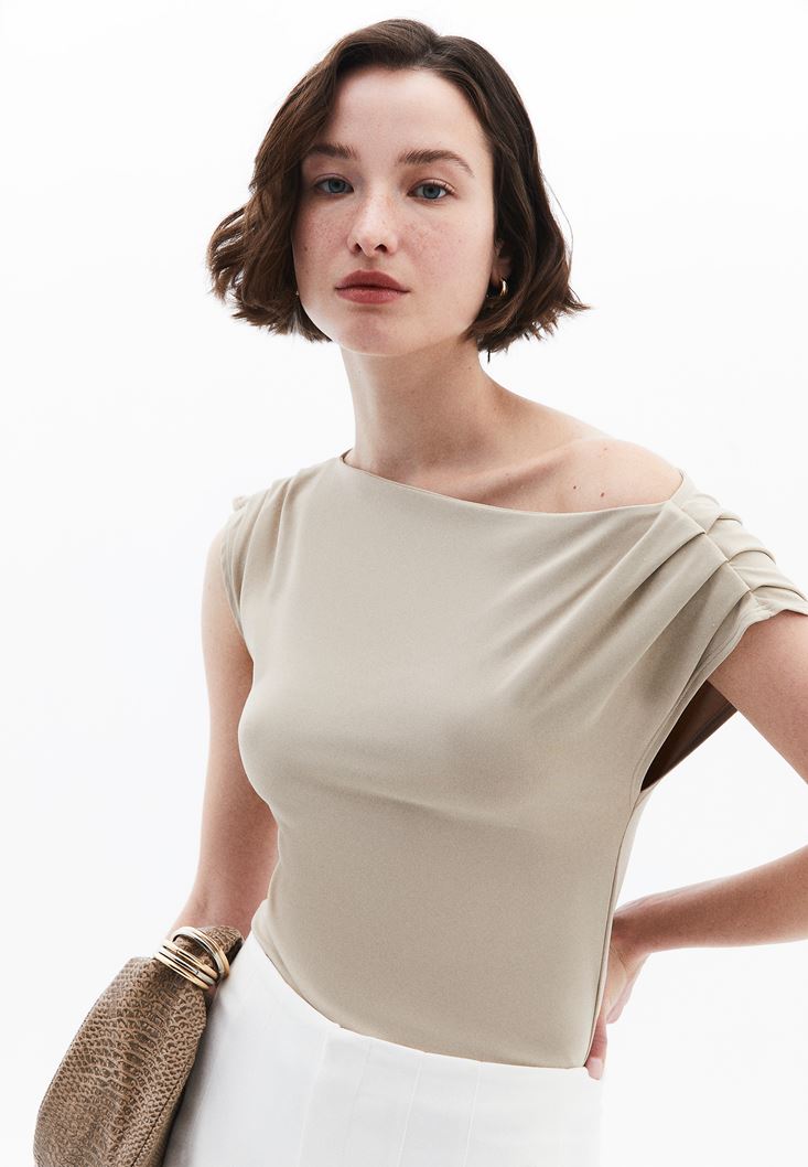 • Women Beige Boat Neck Blouse with Gathered Detail