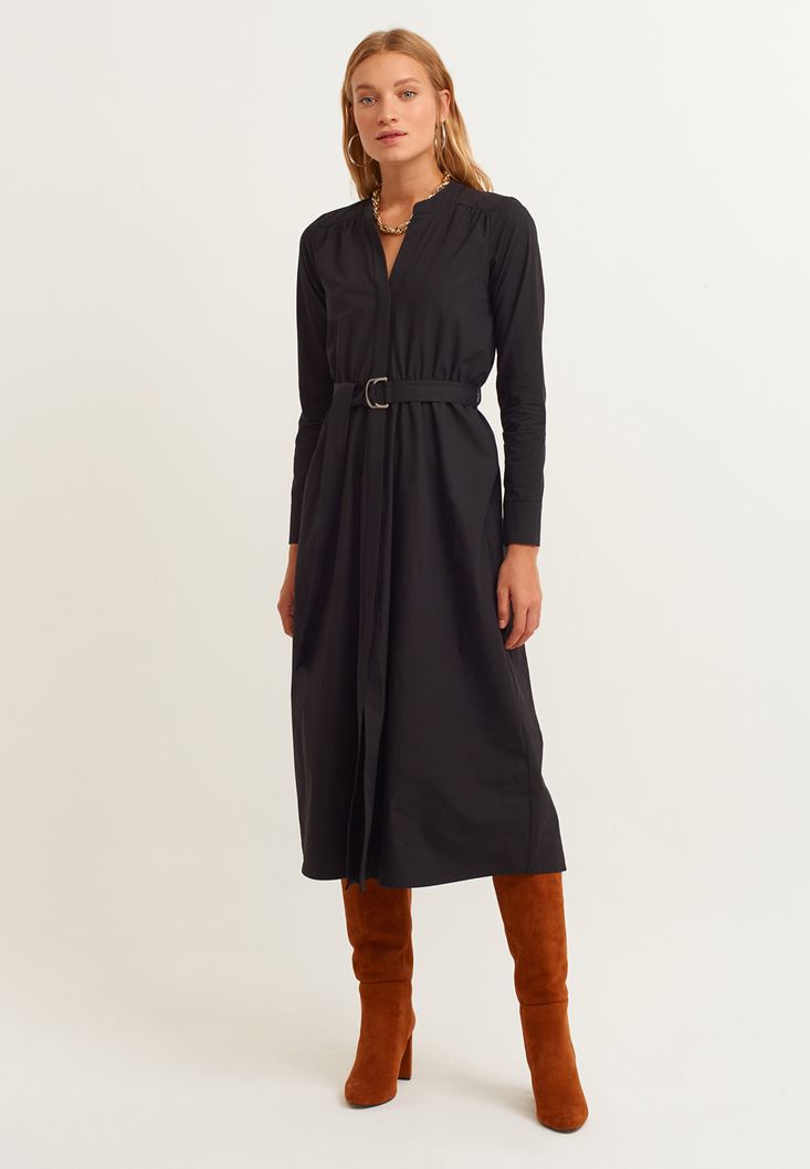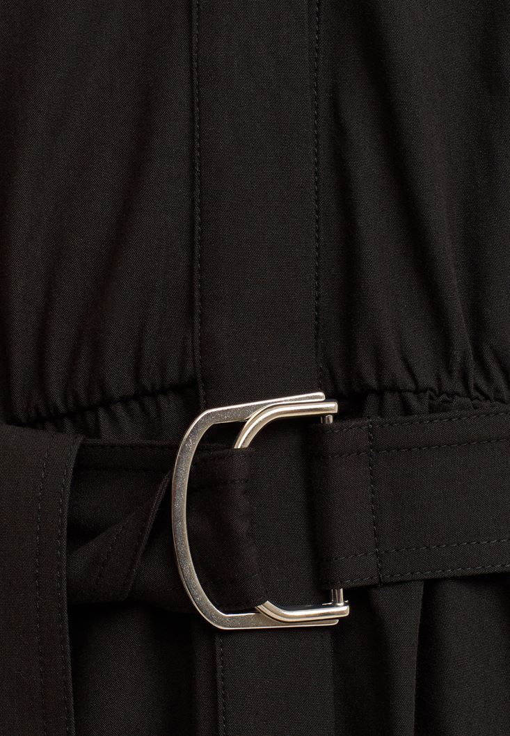 The comfort feeling of cotton texture is highlighted with chic details: self-made belt, concealed button fastening, drapes on shoulders