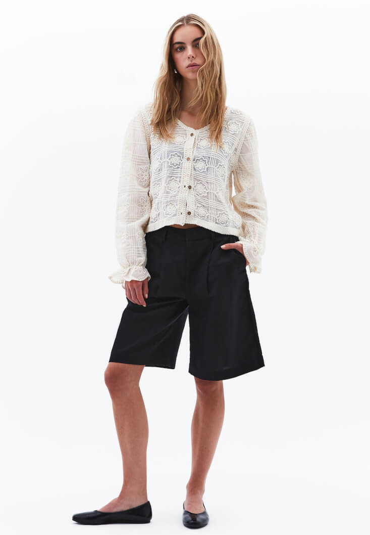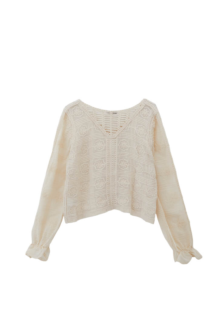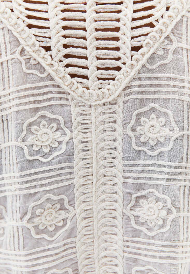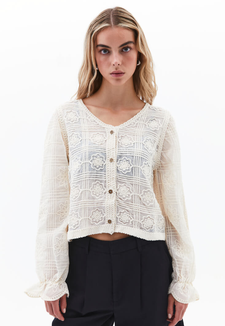Showcases intricate embroidery on the chest area, adding a touch of femininity and sophistication to the blouse.